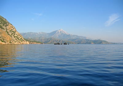 Morgenstille in der Bucht. rechts: der Olympos im Hintergrund