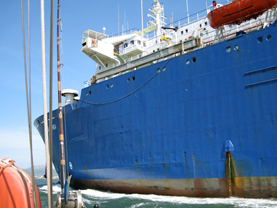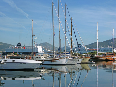 links: Portoferraio: ein Ungetüm wird wieder ins Wasser gekrant, rechts:Olbia: es ist etwas eng im Zufahrtskanal zum Hafen
