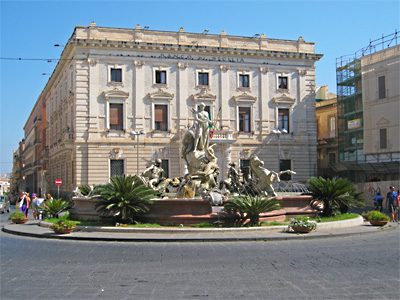 Siracusa: links: die Piazza del Duomo, rechts: Piazza Archimede und der Diana-Brunnen.