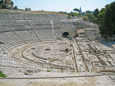 Siracusa: links: das römische Amphitheater, rechts: das griechische Theater