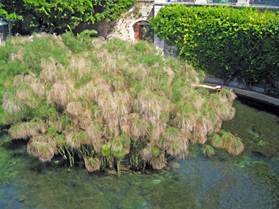 Siracusa: links: der tägliche Gemüse-, Früchte- und Fischmarkt, rechts: der natürliche Brunnen der Aretusa. In der Mitte wächst Papyrus