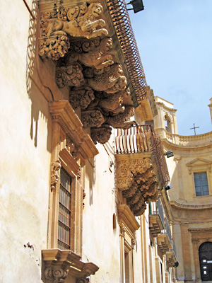 Noto: links: in der Kathedrale, rechts: verzierte Balkone