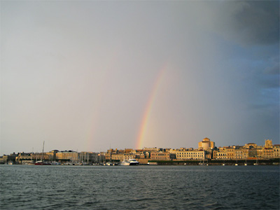 Siracusa: links: eine Gaffelketch kreuzt vor der Stadt, rechts: der Regenbogen über die Ortigia nach einem heftigen Regenguss