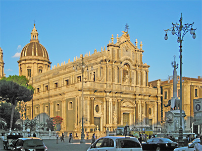 Catania: links: der Elefant, das Wahrzeichen der Stadt, rechts: der Dom in der Nachmittagssonne