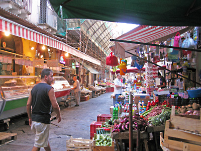 Catania: links: unter der Stadt liegen noch viele alte Bauwerke, rechts: in den Gassen der Altstadt ist an jedem Tag ein schöner Markt