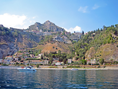 Catania: links: die Yachtstege im Hafen, rechts: in der Höhe Taormina aus der Bucht nördlich von Giardini/Naxos gesehen