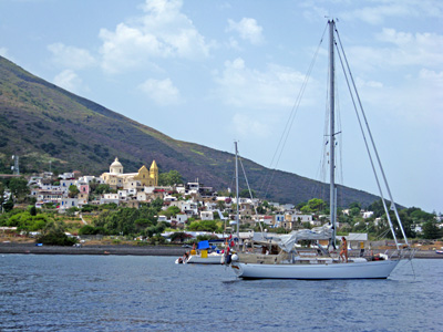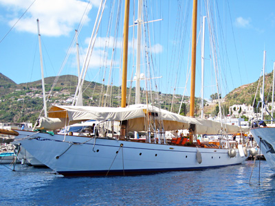Lipari: links: der offene Ankerplatz mit akzeptablen Tiefen unter dem Mönchskloster, rechts: die Puritan, ein Schmuckstück einer klassischen Yacht