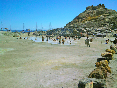 Vulcano: links: die schöne Ankerbucht Porto di Ponente, rechts: das heisse Schwefel-Schlammbad