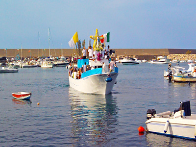 Cefalù: links: der Ankerplatz vor dem Hafen, rechts: es ist das Fest von Maria Himmelfahrt, der Beginn einer Prozession auf Fischerbooten