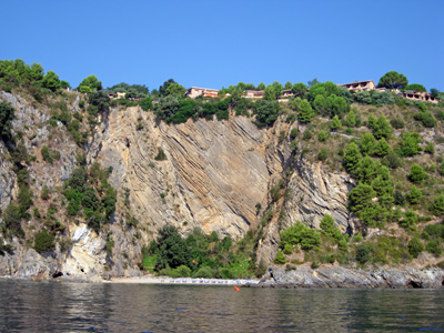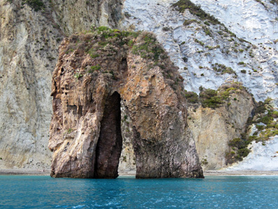 Palmarola: links: in Ponza und in Palmarola hat der Tuffs hunderte von Farben hier an der Ostseite, rechts: die Bucht hinter den Inseln auf der Westseite in der Cala del Porto