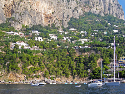 Capri: links: die Faraglioni, rechts: vor Anker unter den schönen Villen bei Marina Piccola