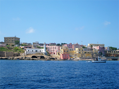 links: Ischia Sant'Angelo, rechts: Ventotene: rechts vom Leuchtturm geht es in den Galeeren-Hafen