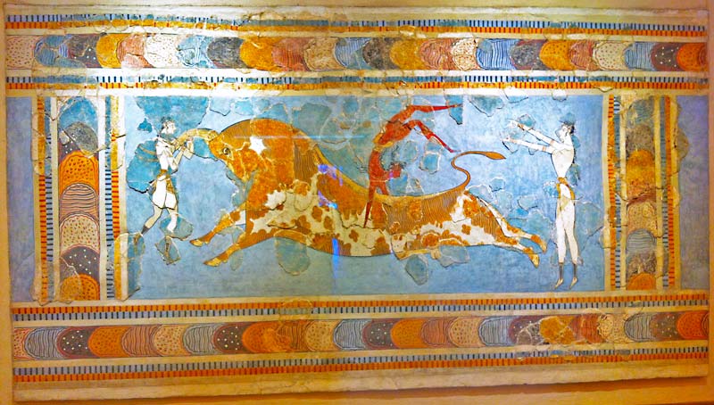 1. Juli 2011: Heraklion Archäologisches Museum. Das akrobatische Spiel mit dem Stier. Von links nach rechts: eine Frau macht sich bereit zum Springen, ein Mann ist gesprungen und eine Frau ist gelandet.