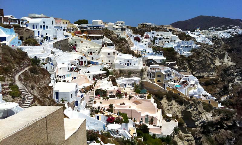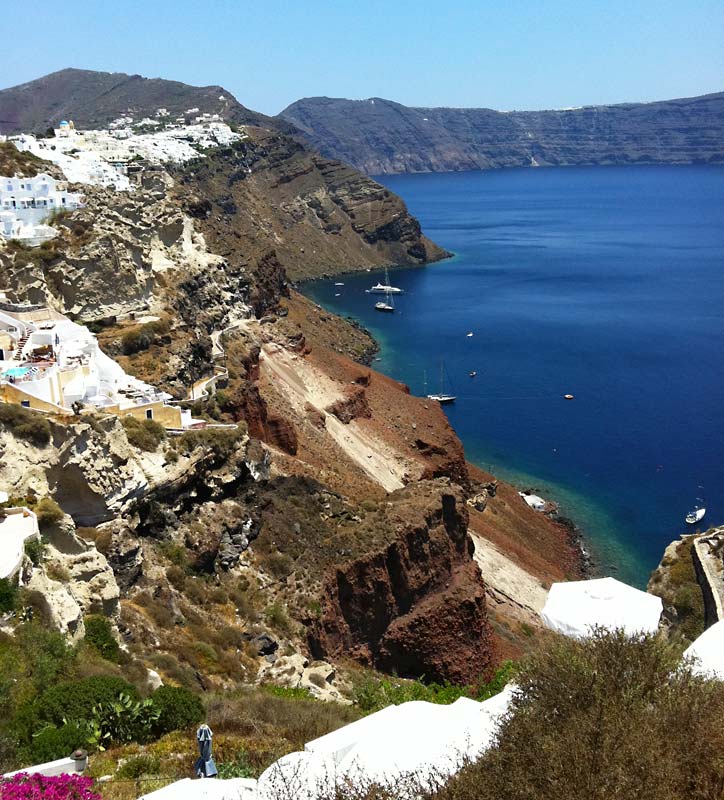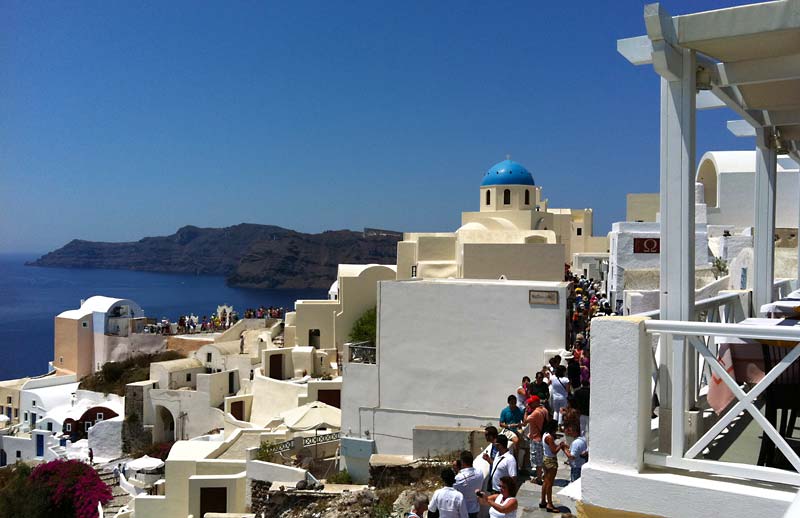 2. Juli 2011: Santorin Panorama aus einem Terrassen-Restaurant in Ia (Oia).