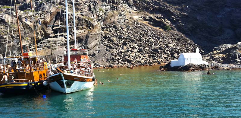 2. Juli 2011: Santorin Der sehr begrenzte Ankerplatz und Bojenfeld unterhalb Fira.
