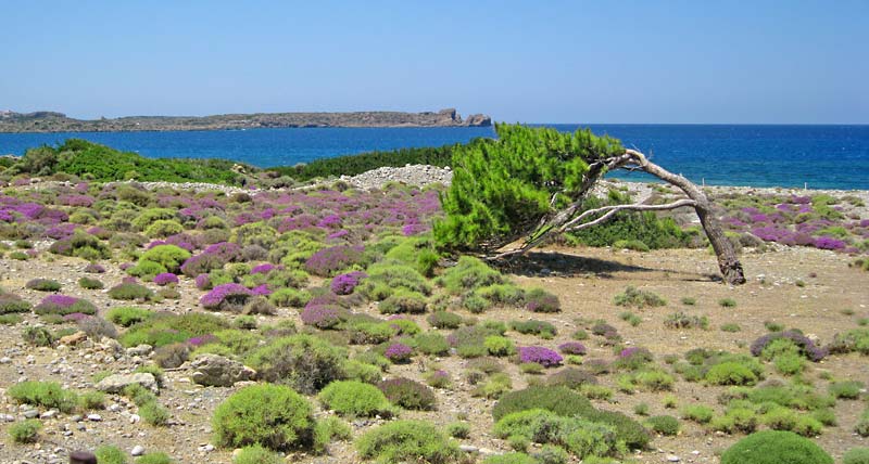 28. Juni 2011: Kreta West Dieser windgekrümmte Baum steht inmitten von blühendem Thymian.