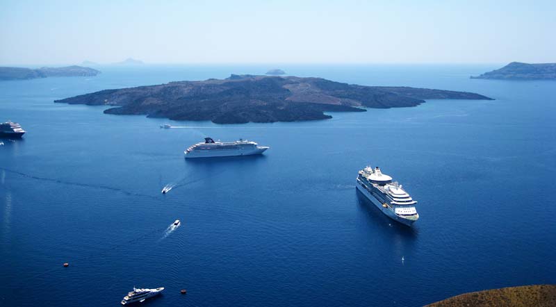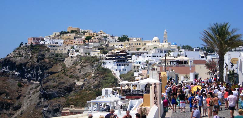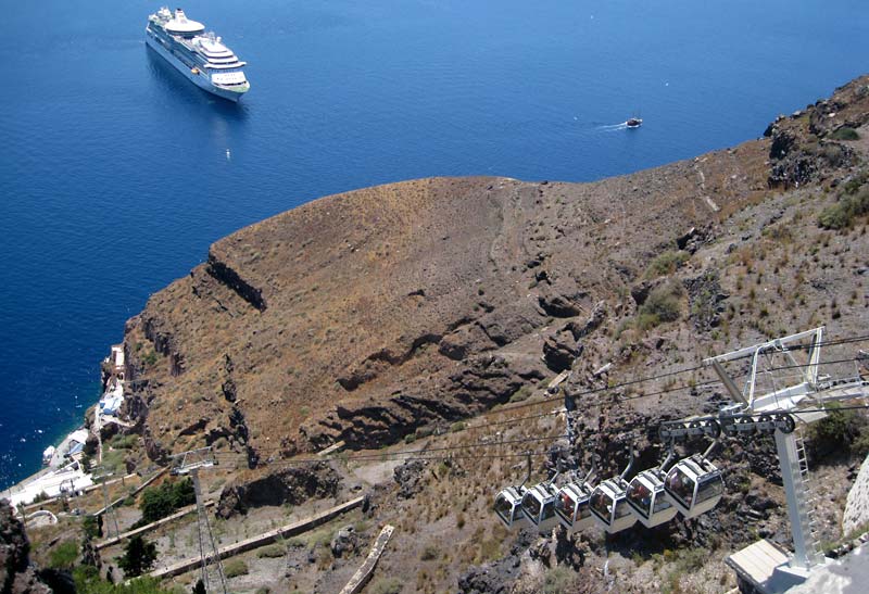 2. Juli 2011: Santorin Eines der vielen Kreuzfahrtschiffen und die Seilbahn nach Fira.