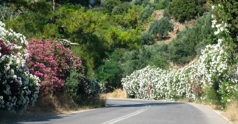 12. Juli 2011: Kreta Ost Die mit Oleander umsäumten Strasse auf dem Weg nach dem Osten von Kreta.