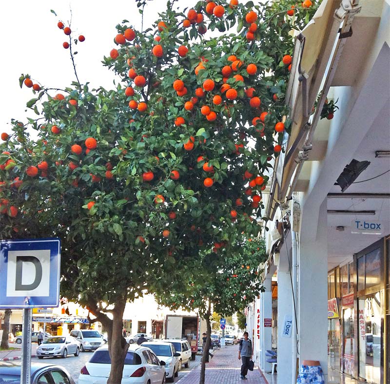16. März 2012: Kemer Die Orangenbäume auf der Strasse tragen allen noch üppig Früchte.
