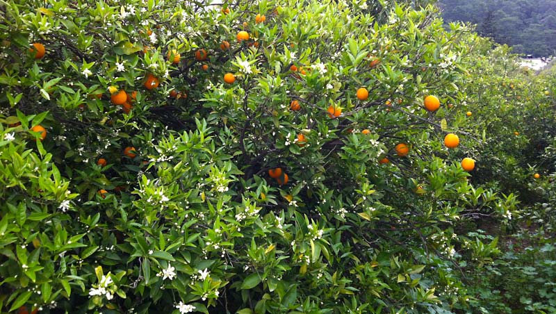 14. April 2012: Kemer die letztjährigen Orangen hängen noch dran und wieder blüht der Baum begleitet von einer phantastischen Duftnote.