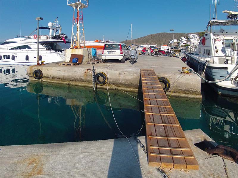 3. Juni 2012:  Milos: Kaum gebaut, schon beschädigt. Die Verbindung des Schwimmstegs mit der festen Betonmole bildet jetzt diese Holzpasserelle.