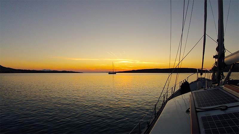 7. Juni 2012:  Zwischen Despotiko und Antiparos  Sonnenuntergang am Ankerplatz zwischen den zwei Inseln