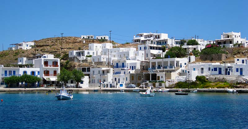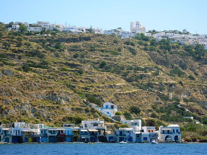 6. Juni 2012:  Milos: Unten, typische Fischerhäuschen am Wasser und oben die Chora von Milos.