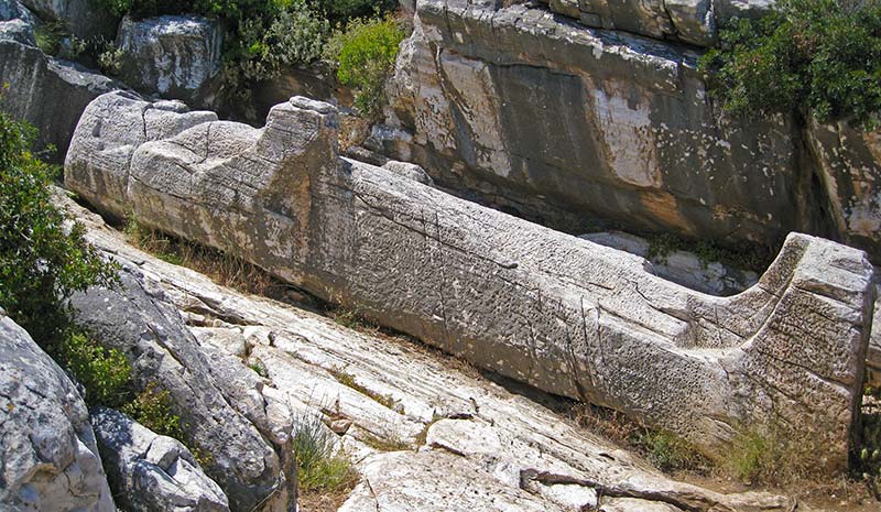 11. Juni 2012:  Naxos  Eine unfertige Statue von Dionysos in einem Marmor-Steinbruch bei Apolonas