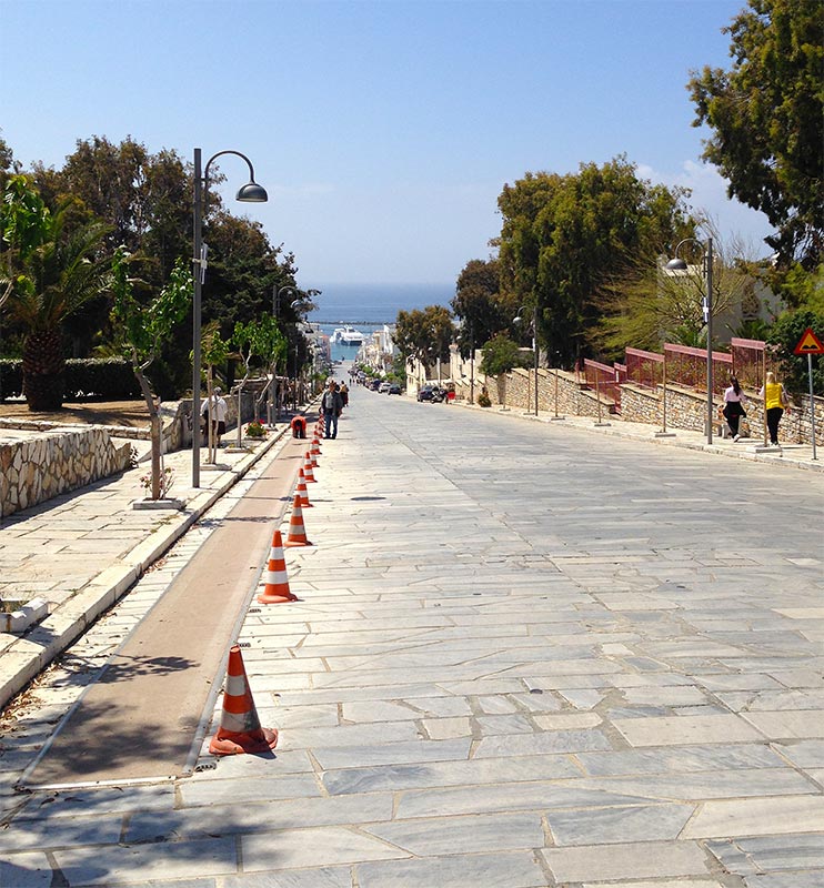 04.05.2014 Tinos - Die Strasse vom Hafen zu der Wallfahrtskirche. Auf dem Teppich links im Bild gehen Gläubige kniend hoch.