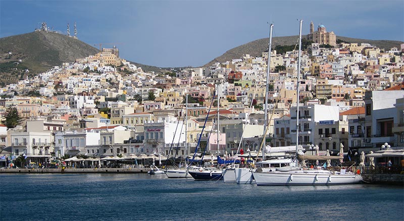 09.05.2014 Syros - Ermoupoli - Yachten am Quai, die Stadt und die zwei Hügel