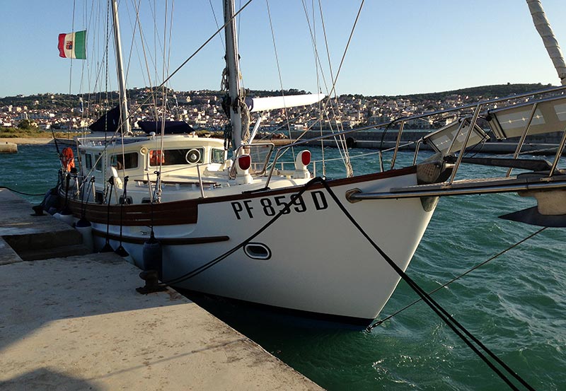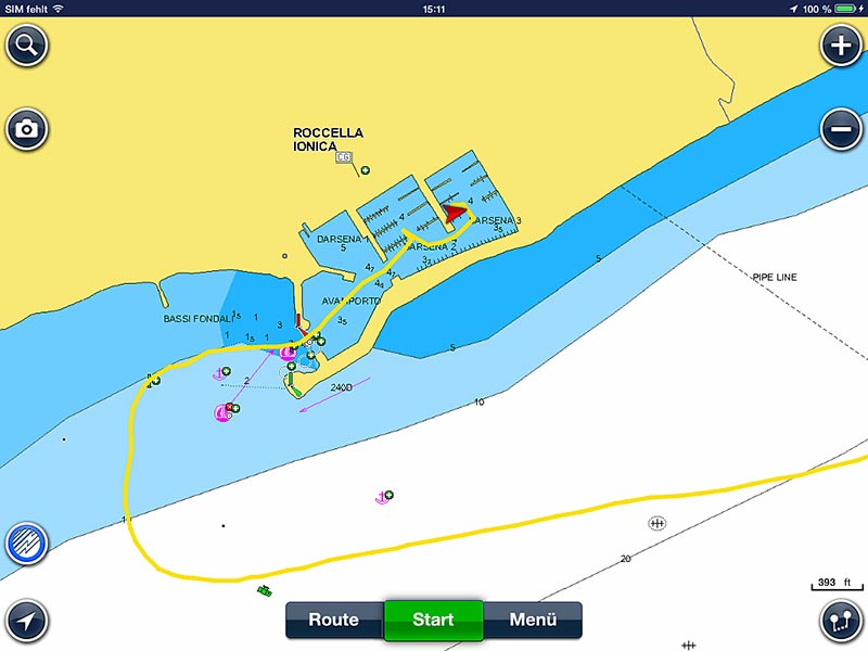 18.08.2014 Roccella Ionica: Zum Hineinfahren in den Hafen muss man einen grossen Bogen um die Aussenmole wegen der Sandbank machen