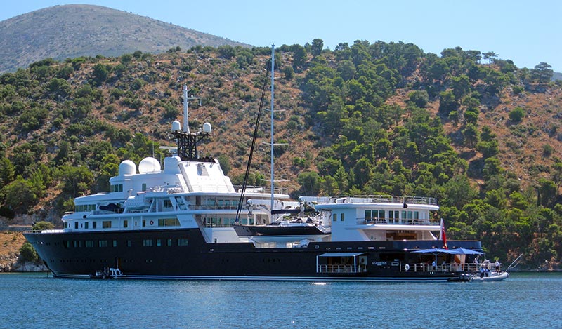 02.07.2014 Kefallonia Argostoli: Die Megayacht Le Grand Bleu vom Russen Jewgeni Schwidler mit je einer grossen Segel- und Motoryacht huckepack...