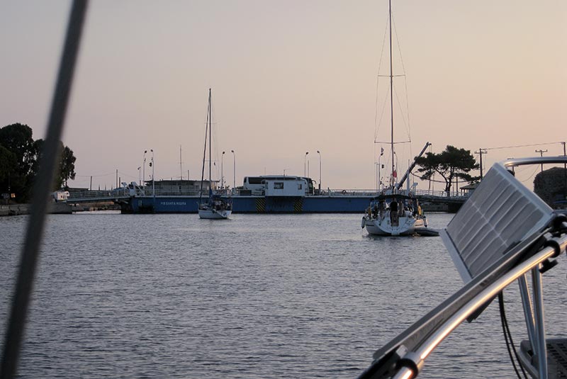30.07.2014 Lefkas: Die Schiffe warten auf das Aufgehen der Brücke um nach Norden aus dem Kanal von Lefkas zu fahren