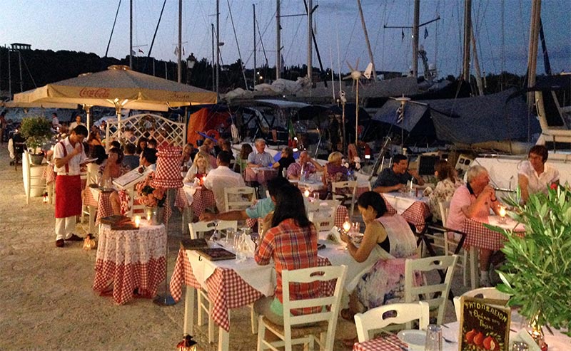 27.06.2014 Kefallonia Fiskardo: Gut besetzte Restaurants am Abend