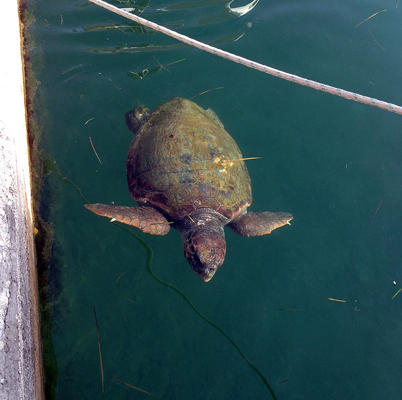 30.06.2014 Kefallonia Argostoli: Eine der vielen Meeresschildkröten im Hafen