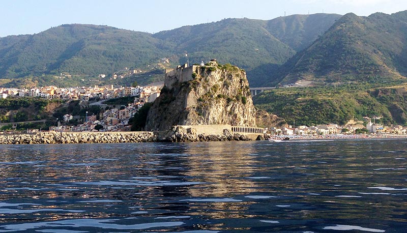 21.08.2014 Scilla: Der Felsen des Seeungeheuers Skylla aus der Odyssee am nördlichen Ausgang der Strasse von Messina