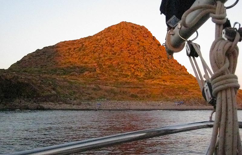 29.08.2014 Filicudi: Am Anker vor dem kleinen Strand an der Südseite von Filicudi. Capo Graziano im Licht der untergehenden Sonne.