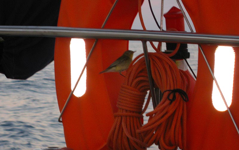 14.09.2014 Auf der Fahrt nach Sardinien: Ein kleiner Vogel ruht sich in der Mitte des Tyrrhenischen Meeres kurz auf unserem Boot aus