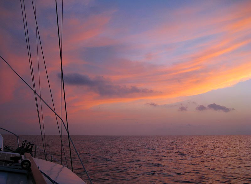 1.10.2014 Auf der Fahrt von Solenzara nach Elba: Wolken im Rot der aufgehenden Sonne