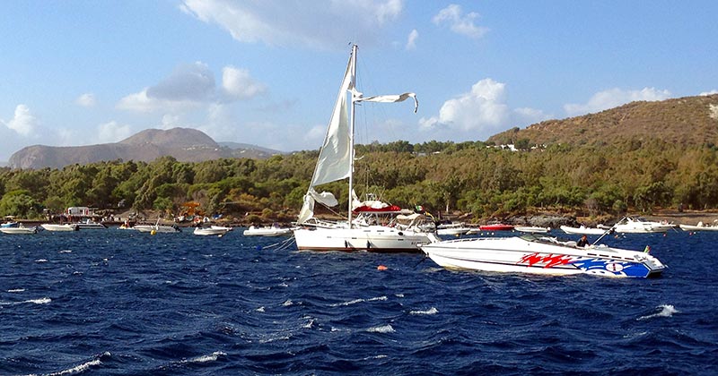 01.09.2014 Vulcano Porto di Levante: Starkwind und eine Segelyacht ist mit zerrissener Genua angekommen