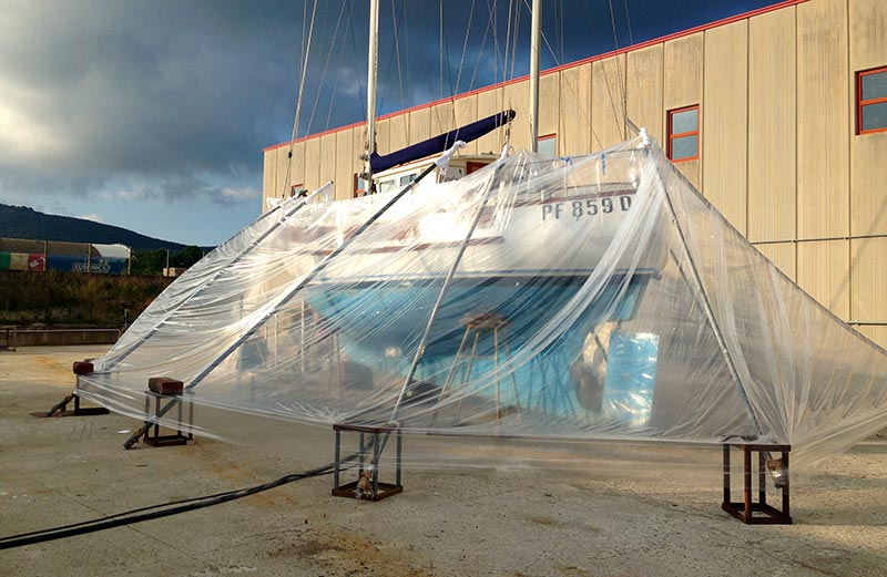 30.10.2014 Elba Portoferraio: Rondinara eingepackt und bereit zum Sandstrahlen