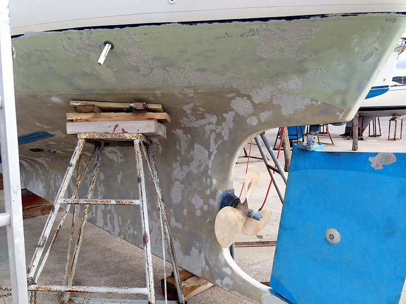 07. 11.2014 Elba Portoferraio: Rondinara nach dem Sandstrahlen und partiellem Abschleifen wartet nun auf das Trocken des Rumpfes